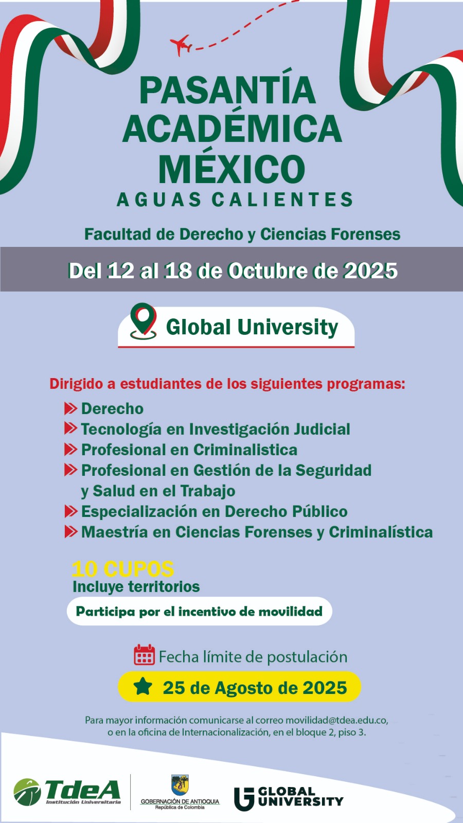 Del 12 al 18 de octubre de 2025, la Facultad de Derecho y Ciencias Forenses de Global University vivirá una experiencia única de inmersión académica y cultural en alianza con el Tecnológico de Antioquia (Colombia).